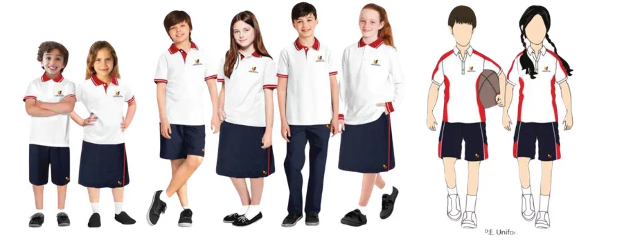 Pre-School & Primary Uniform: White polo shirt with red and navy details, paired with navy shorts or a skirt.